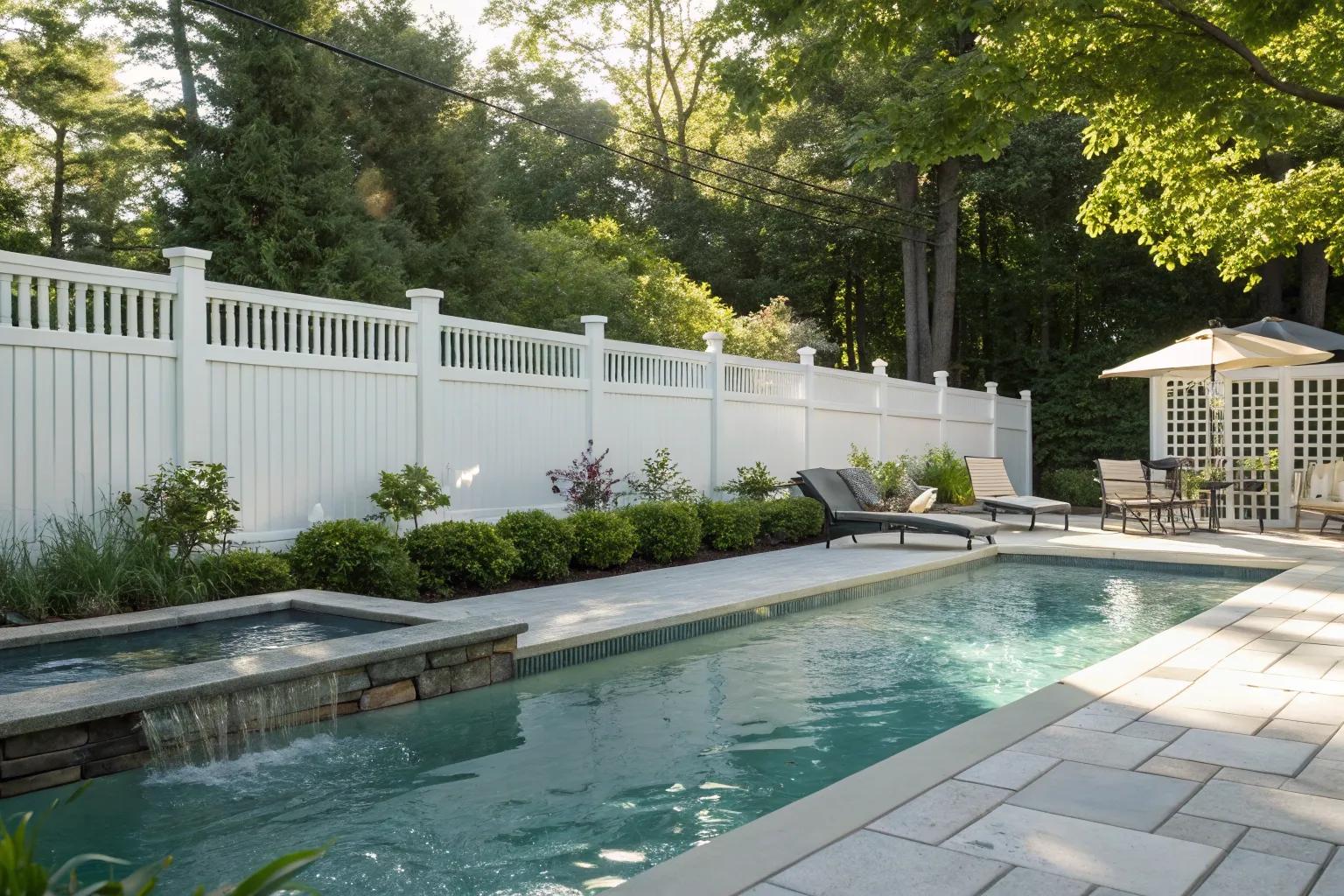 If you prefer simplicity, a minimalist white fence with clean lines can be just the ticket. I’ve used this approach to create a serene, uncluttered look that lets the pool shine.