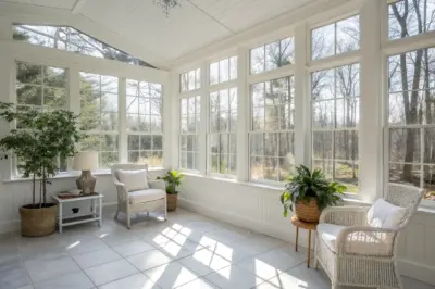 Wooden floors or furniture add warmth to a white sunroom. Clients love how these elements create a balanced, inviting ambiance.