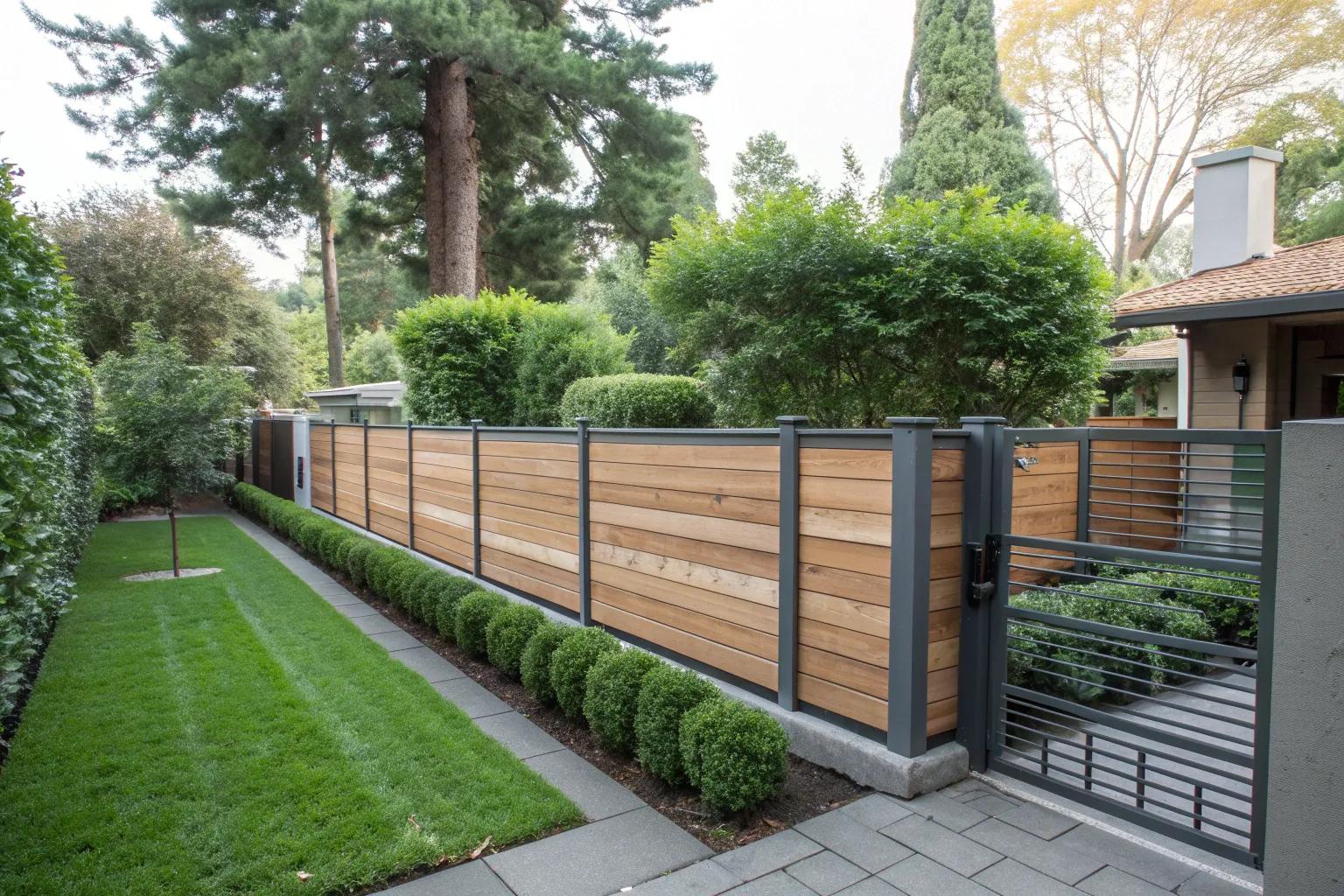 Horizontal wooden slats paired with sturdy metal posts offer a modern and clean-lined aesthetic. In my own backyard, this design acts as the perfect backdrop for a minimalist garden.