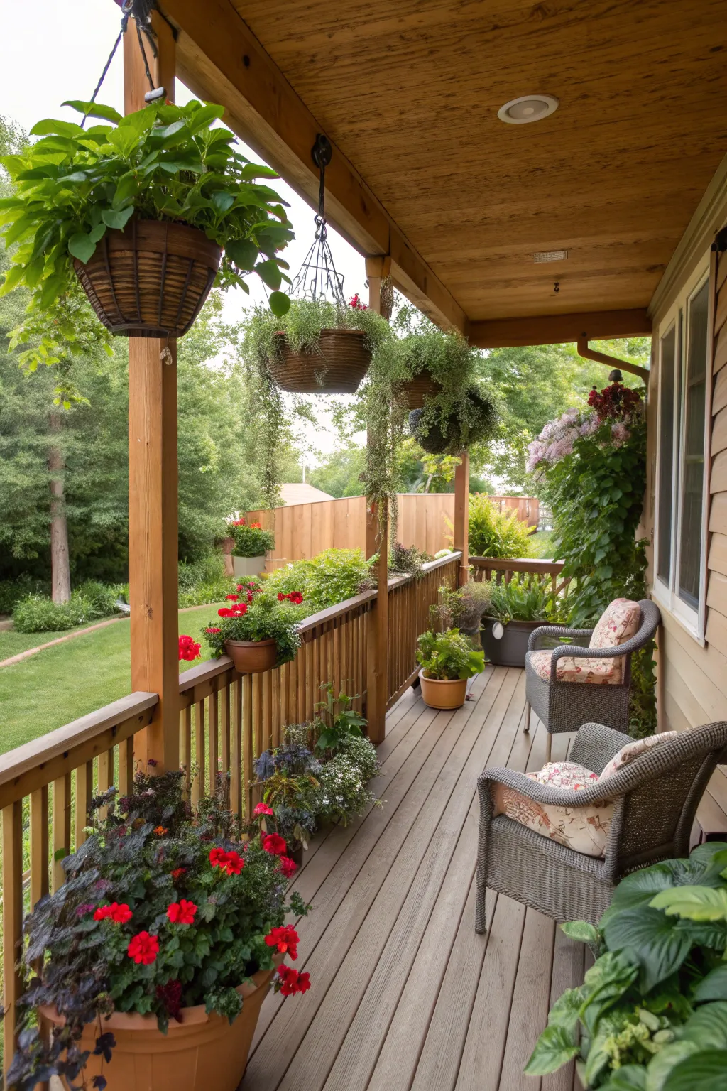 - Hanging Flower Pots: Brighten your porch with colorful hanging pots, enhancing beauty and natural charm effortlessly.