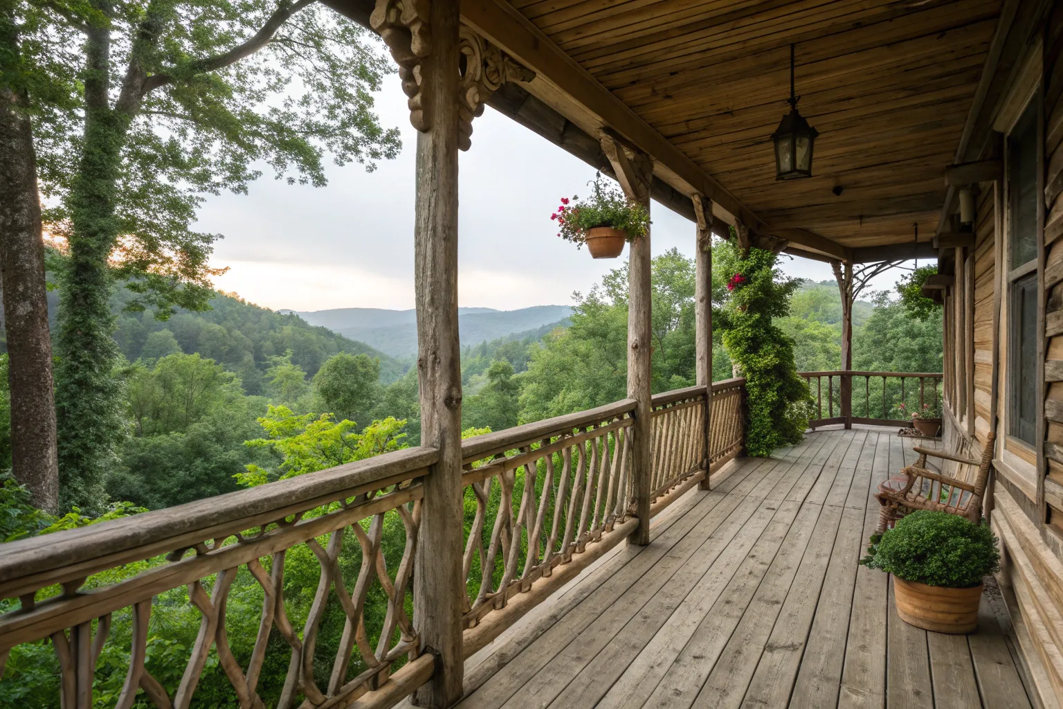 For a taste of the wilderness, rustic log railings are your go-to. They bring a rugged charm, perfect for cabins or homes with a natural vibe – something I often recommend to clients seeking a cozy, nature-inspired look.