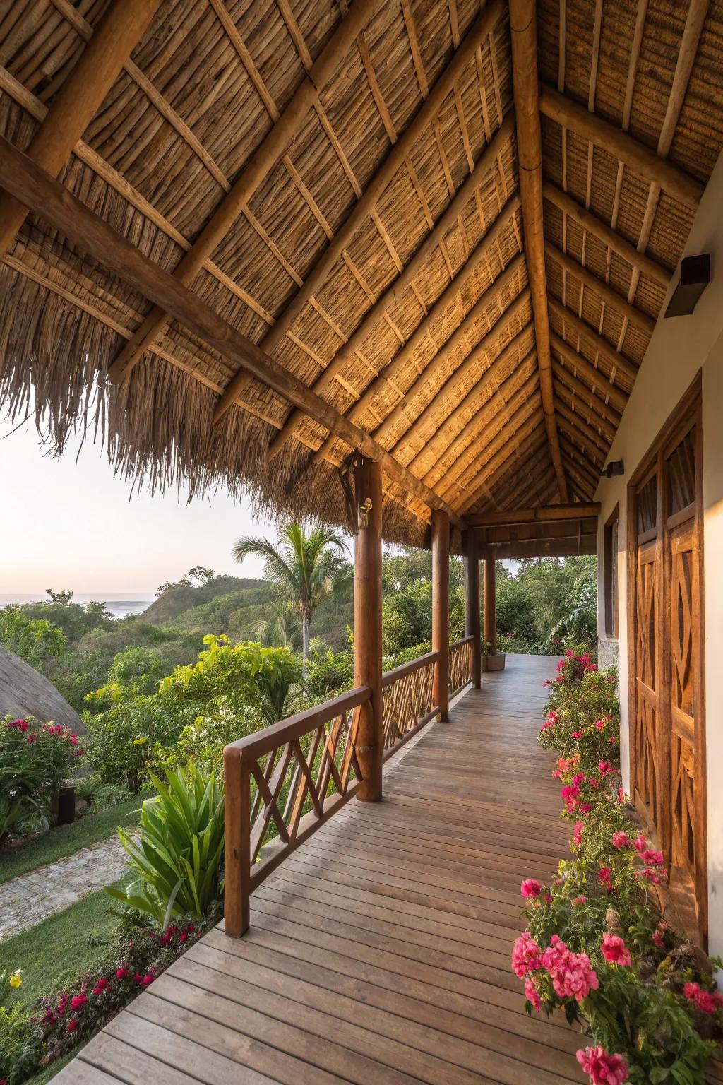 A thatched wood roof brings a laid-back, tropical atmosphere to your porch. It’s perfect for creating a beachside cabana feel right at home.