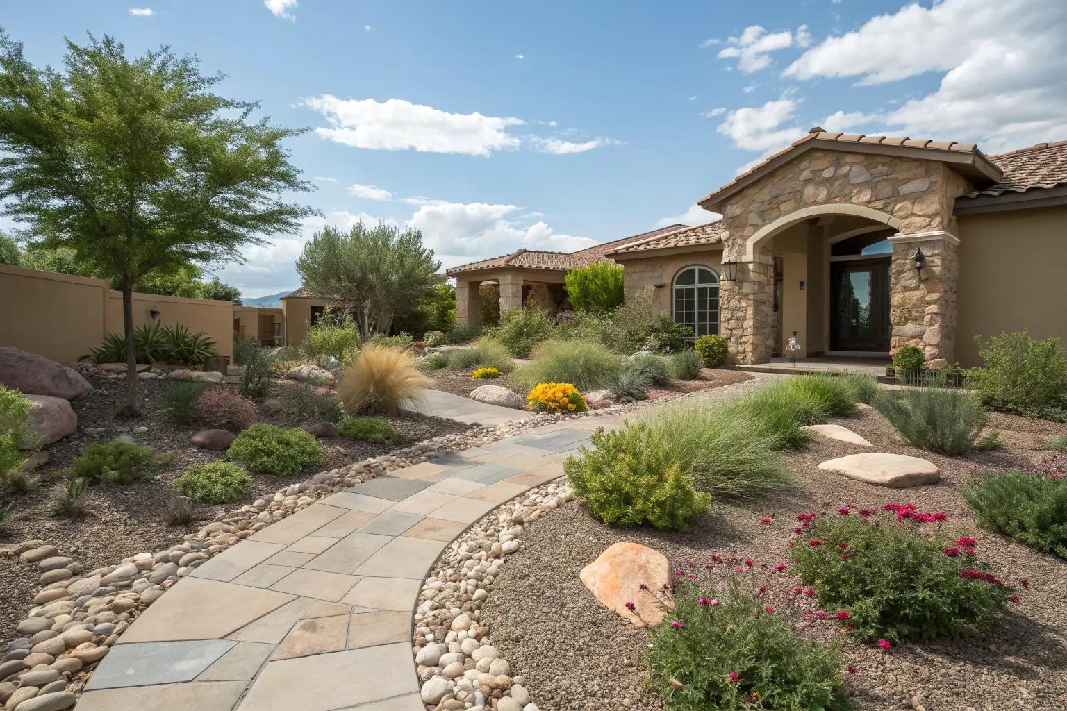 Stone or gravel pathways not only guide visitors but also integrate seamlessly into the xeriscape design. They’re a favorite feature in many of my projects.