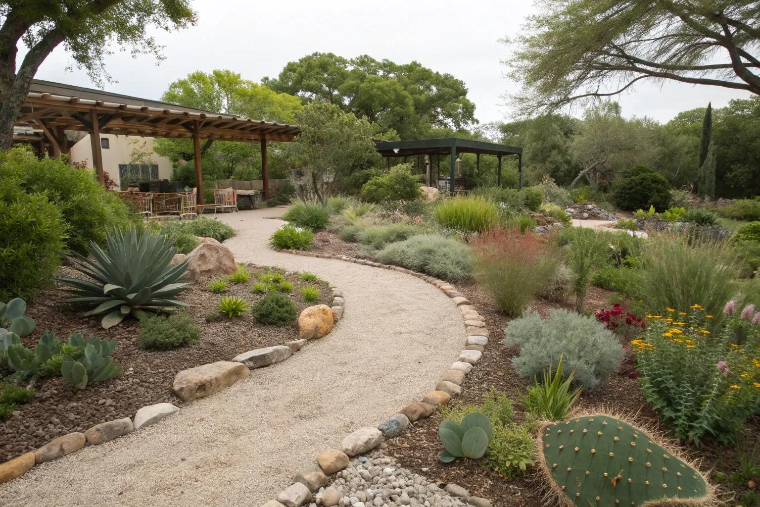 Design gravel paths that wind through your garden, adding structure without the need for watering. This low-maintenance feature keeps your garden looking neat and inviting.